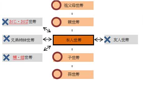 通常の申込資格を満たし、入居本申込時点において、次のすべてに該当する方の世帯。 ①下図・○印(直系血族)の世帯と近居する方の世帯。